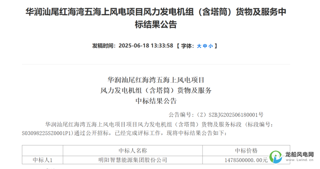 6月18日,华润集团守正电子招标平台发布《华润汕尾红海湾五海上风电项目风力发电机组(含塔筒)货物及服务中标结果公告》。