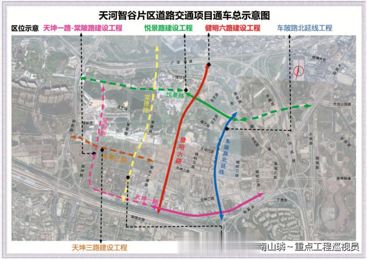 车陂路北延线(天坤一路—悦景路段) 悦景路(健明六路—车陂路北延线段)长580米、宽40米,双向6车道,设计车速50km/h,本段建成开通后,可完善片区路网,弥补智谷片区北侧路网不足的缺陷;为周边已建成的住宅小区和公建配套设施解决北向出行难题,提供便利的出行服务,同时有效缓解正在开发的太平洋保险康养、人才公园等地块的交通出行压力,提升土地利用价值,推进片区整体发展。